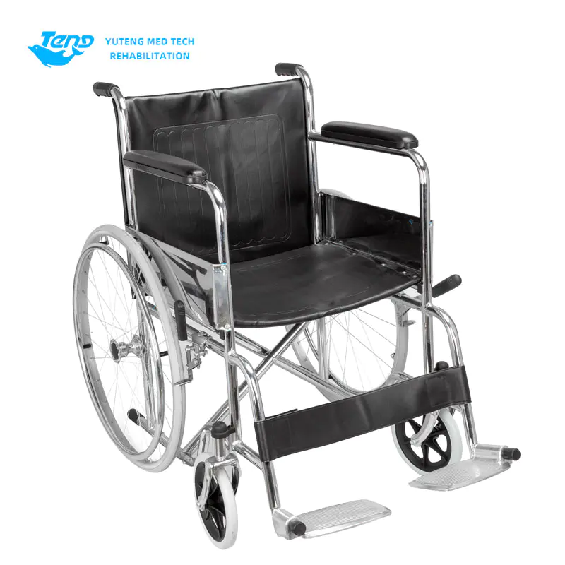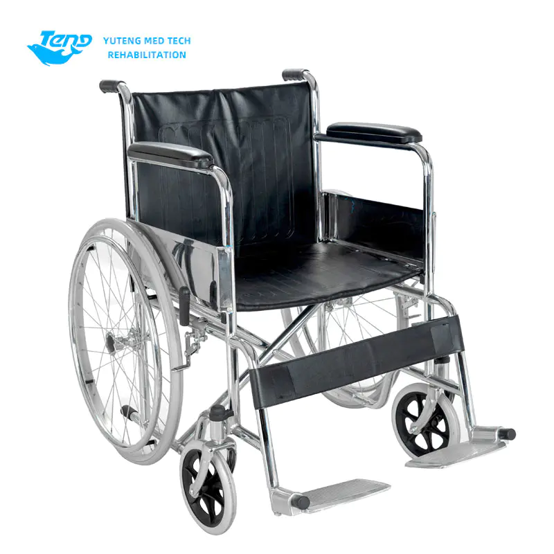 Yuteng produktu medikoak Adinekoentzako gurpildun aulkirako, altzairuzko gurpildun aulkia da, erizaintza eskuzko gurpil-aulkia. Altzairuzko kromatutako marko bat da; PVC larruzko eserlekuko atzeko kuxin; Oinen laguntza finkoa; Hainbat konfigurazio pertsonaliza daitezke.
